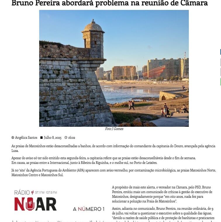 Praias de Matosinhos desaconselhadas a banhos: Bruno Pereira abordará problema na reunião de CâmaraFonte: Notícias ao minutoRead more by Bruno Pereira 2025