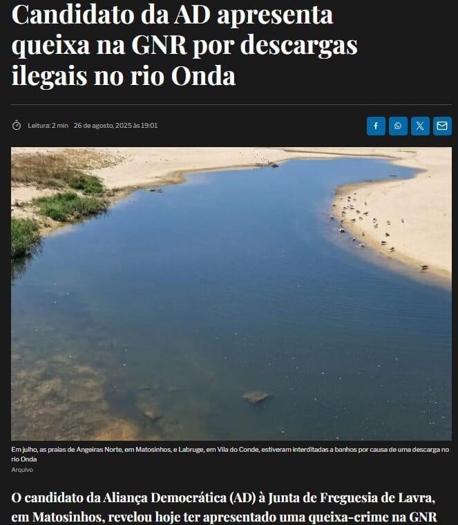 Candidato da AD apresenta queixa na GNR por descargas ilegais no rio OndaFONTE: Jornal de NotíciasRead more by Bruno Pereira 2025
