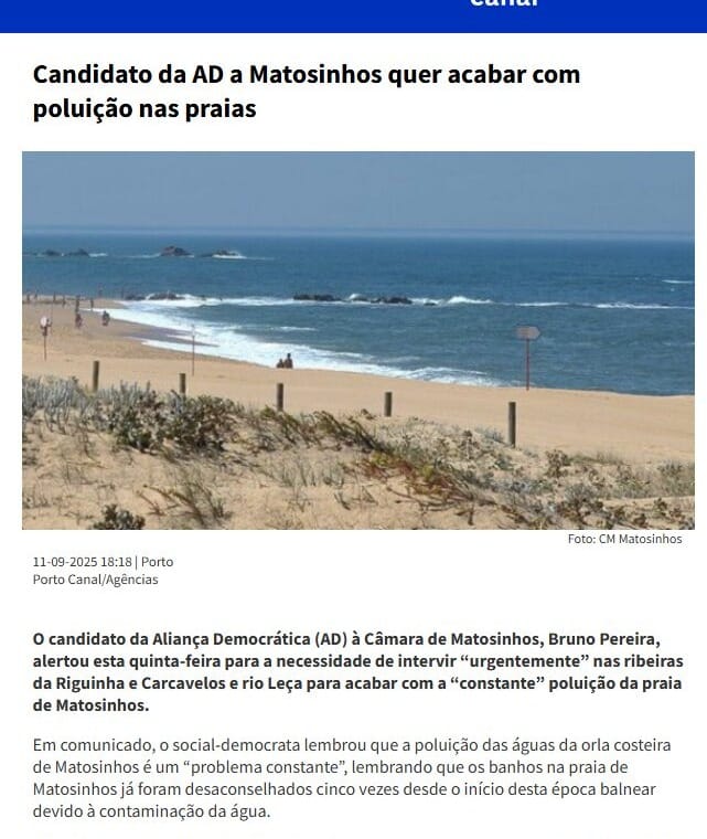 Candidato da AD a Matosinhos quer acabar com poluição nas praiasFONTE: Porto CanalRead more by Bruno Pereira 2025